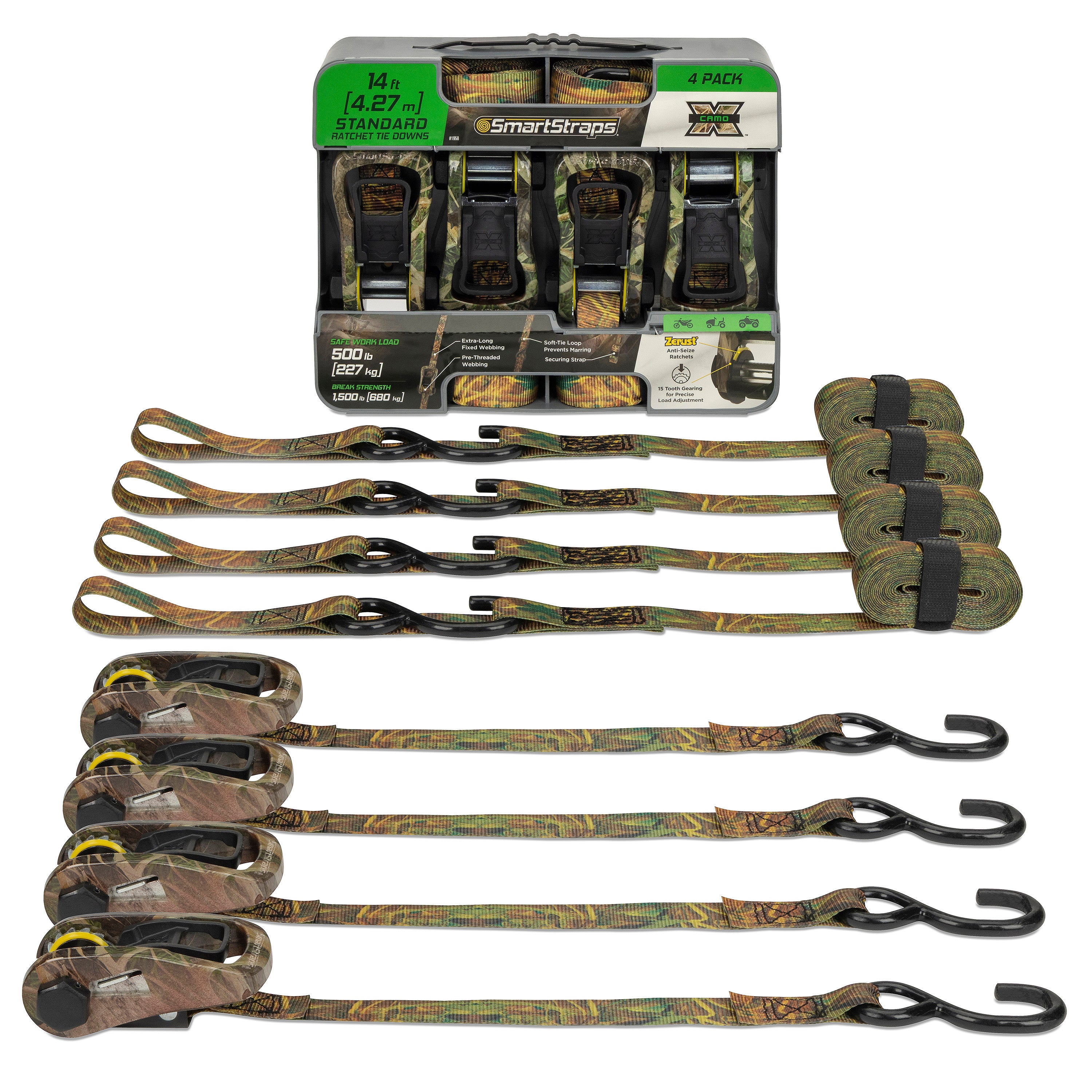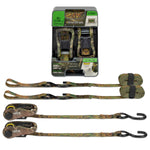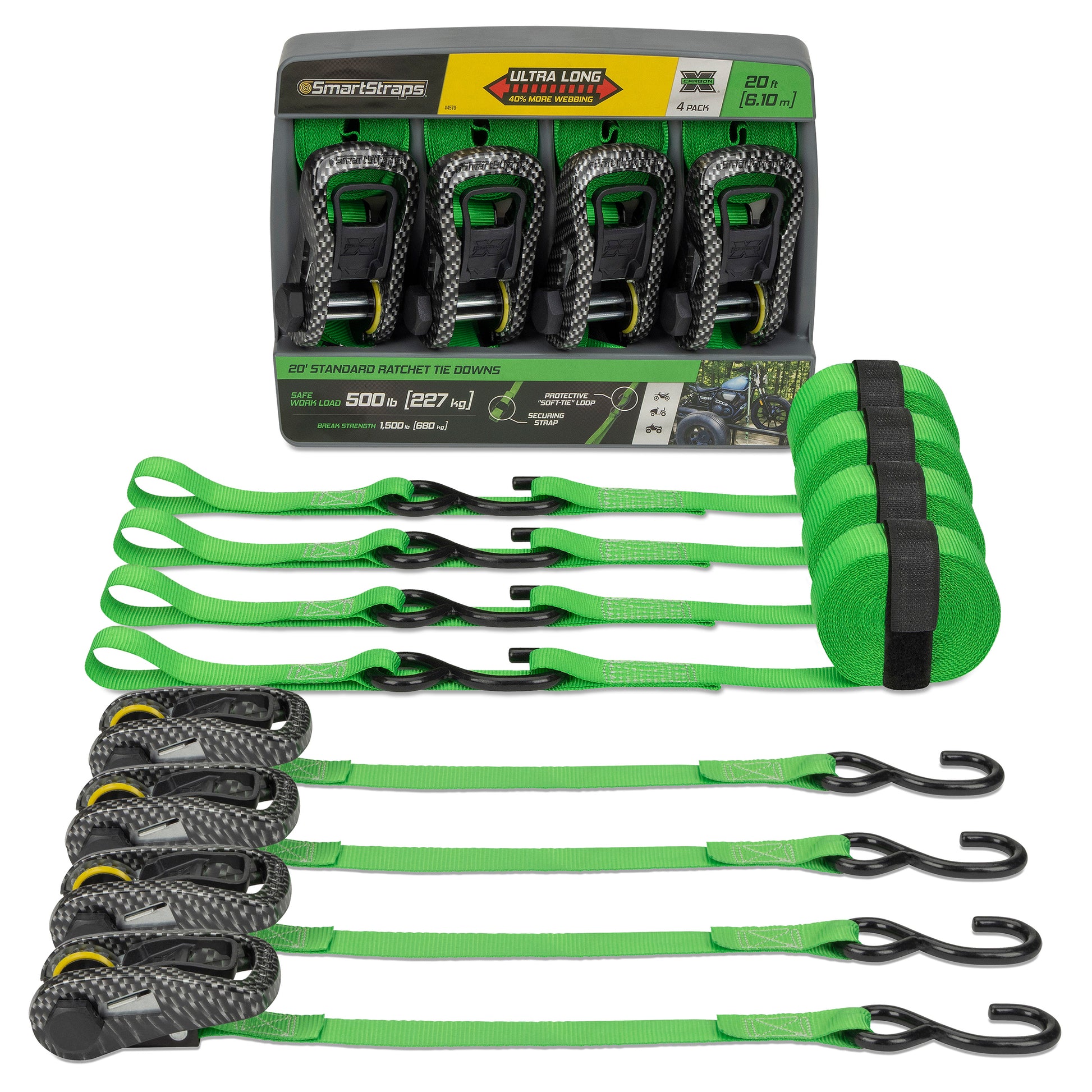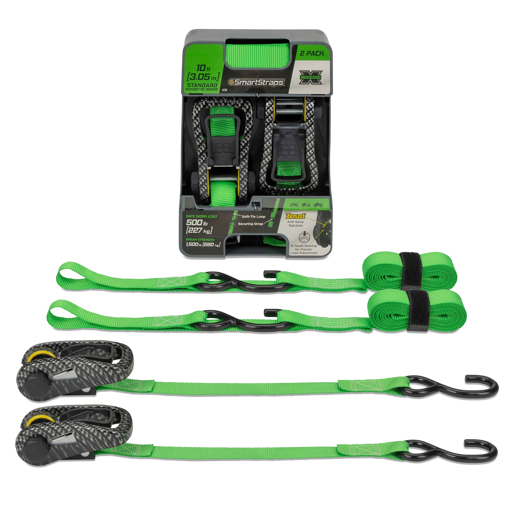 The SmartStraps CarbonX ratchet tie down is a standard duty tie down used for securing lighter loads often hauled in a pick-up truck or on a small trailer such as dirt bikes, ATVs, and lawn tractors. Stronger and more user friendly than standard ratcheting tie downs. Features extra-long webbing on attachment end for hard-to-reach anchor points. The pre-threaded webbing also helps prevent accidentally feeding the webbing from the wrong direction. Includes protective hex caps to help keep the ratchet mechanism clean, soft tie loops to prevent scratching, and a convenient securing strap to make it easy to tie off excess webbing or to keep your straps bundled after use. The strap features precision gearing thanks to more teeth along the sprocket of the ratchet, allowing the tension to stay under control when securing loads. Included Zerust material acts as a rust-inhibitor to improve the longevity of the ratchet. Also available as a Camo X (camo pattern material) or with ultra long webbing.
