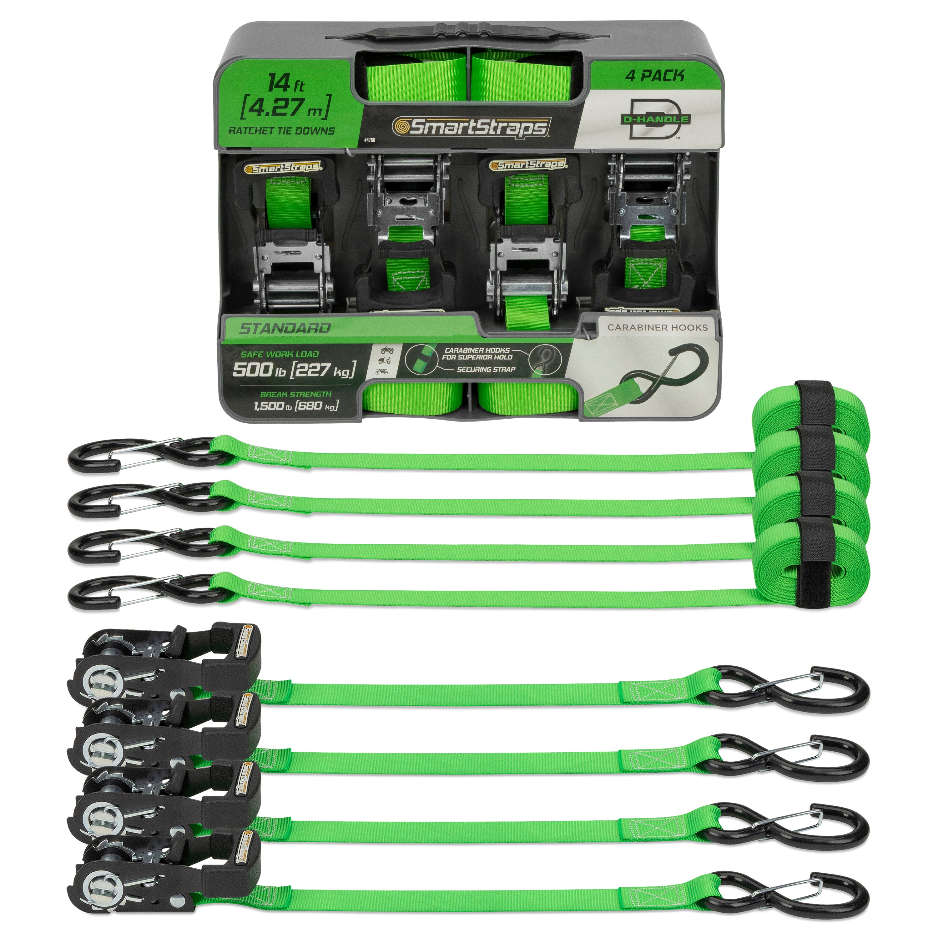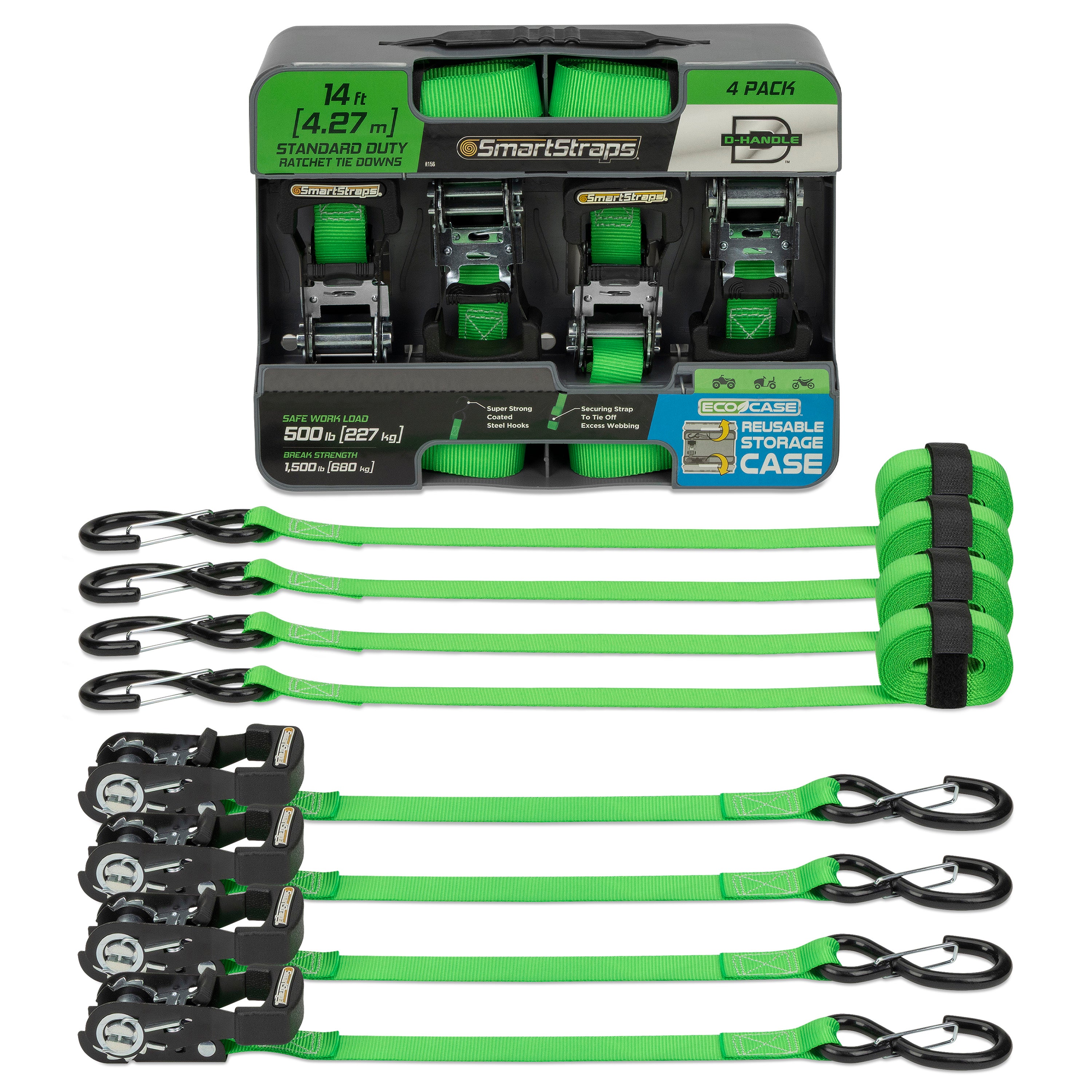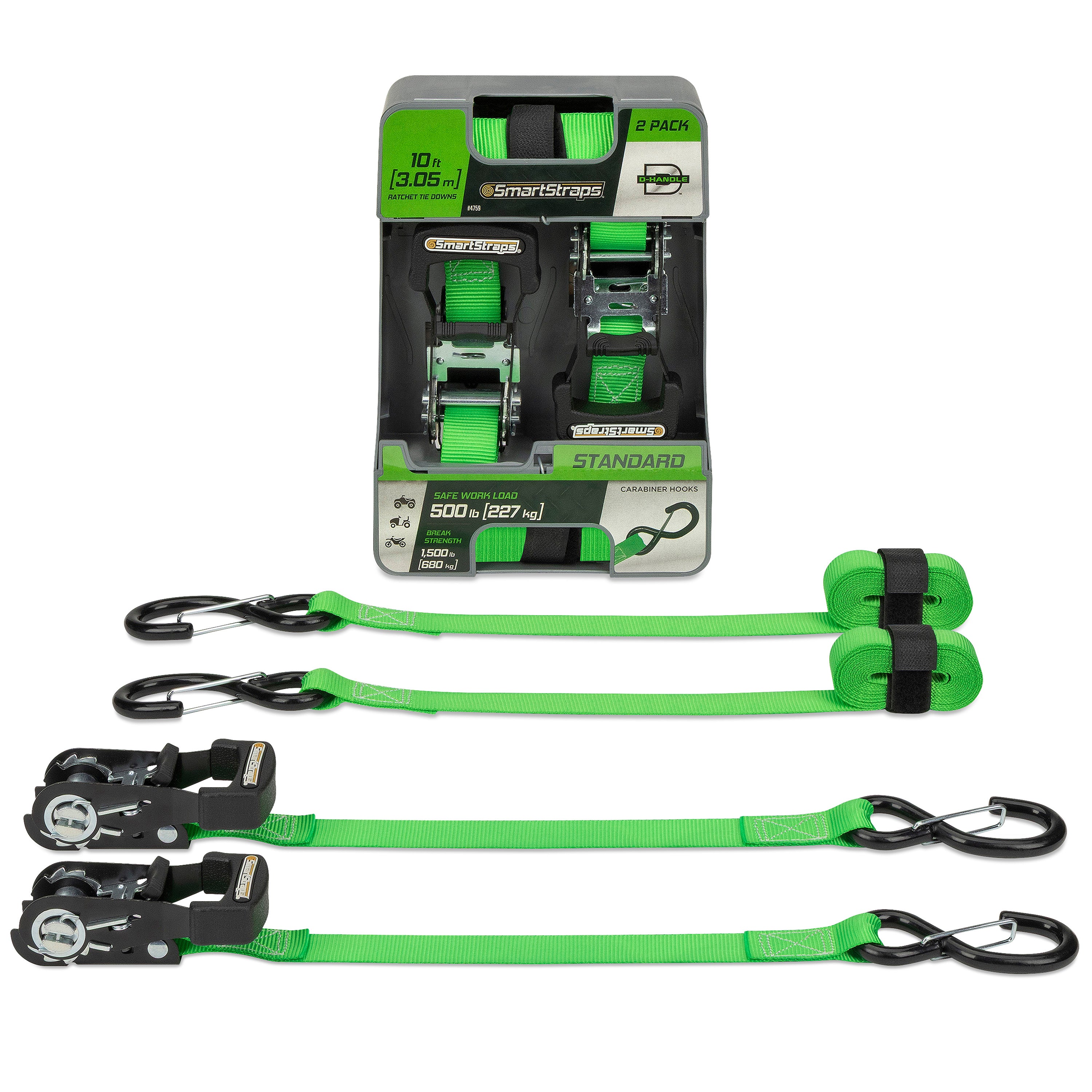The SmartStraps Padded D-Handle ratchet tie down is a standard duty tie down used for securing lighter loads often often hauled in a pick-up truck or on a small trailer such as dirt bikes, ATVs, and lawn tractors. Stronger and more user friendly than standard ratchet tie downs. Includes a convenient securing strap to make it easy to tie off excess webbing or to keep your straps bundled after use and has extra long webbing on the attachment end for hard-to-reach anchor points. Also available with gated (carabiner) hooks.